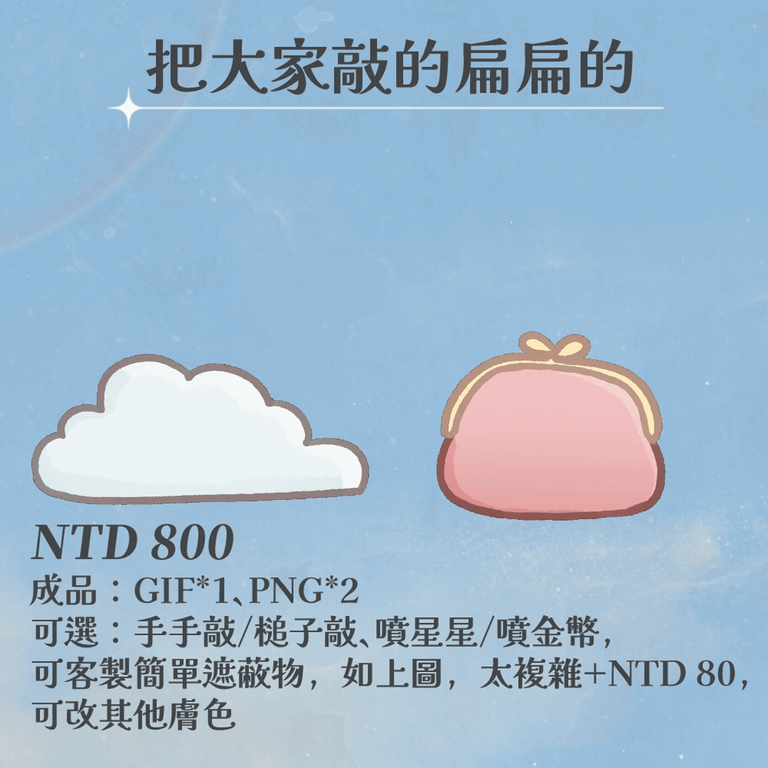 ꕥ委託流程: 填表單 ▷確認委託內容 ▷付款排單 ▷等待開工 ▷確認成品❗注意❗: ◈一鍵出成品,工期約一個月,除非繪製錯誤,否則不提供修改。 ◈簡單遮蔽物請提供參考圖與想要的裝飾或顏色,太複雜會+NTD 80,未指定則預設為雲朵。 ◈設定會簡化,如有不想簡化的部分可提前告知。 ◈會在直播中繪製,請留意。 ◈成品僅可用於 SNS 或直播,禁止印製及販售。 ◈確定委託後視同已閱讀並同意以上內容。